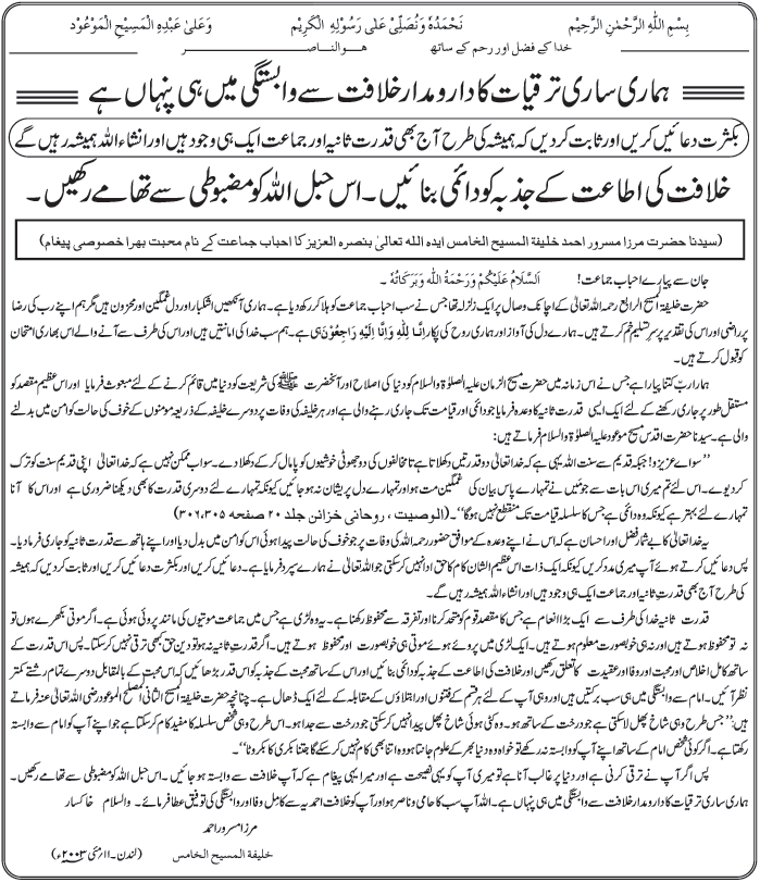 �So my dear ones! It has been the way of Allah from the beginning that He displays two �manifestations� of His Power in that two false delights of the opponents are manifestly demolished. It is therefore not possible that God Almighty should now abandon this long established way. Therefore, do not grieve at what I have imparted to you and do not be heartbroken for you are destined to witness the � second manifestation� which will be better for you because it is everlasting and its linkage will not be terminated till the Day of Judgment�. (Al Wasiyyat. Roohani Khaza�een. Vol. 20 pages 305, 306)It is a tremendous grace and favour of Allah the Exalted that He changed the state of fear generated at the passing away of Hazoor ( rahma�ullah ta�ala) into peace and set the �second manifestation� in motion through Divine decree. Therefore assist me with prayers, because one individual alone cannot honour the magnificent task that Allah the Exalted has designated to us. Engage in prayers and make these prayers abundant and demonstrate that as ever, today too the �second manifestation� and the Community is as one being and Inshallah will always remain so.