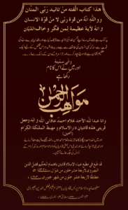 ’’مواھب الرحمٰن‘‘ حضرت مسیح موعودؑ نے مصری جریدہ اللّواء کے ایڈیٹر ’’مصطفیٰ کامل پاشا‘‘ کے ان اعتراضات کے جواب میں تحریر فرمائی جو اس نے ایک انگریزی اشتہار دیکھنے پر حضرت مسیح موعودؑ پر کئے تھے۔