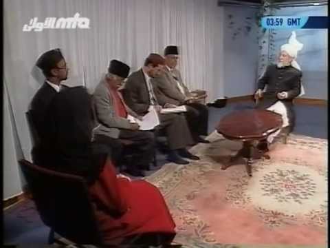 A studio sitting of French speaking friends with Hazrat Mirza Tahir Ahmad, Khalifatul Masih IV(rh) in French and English.